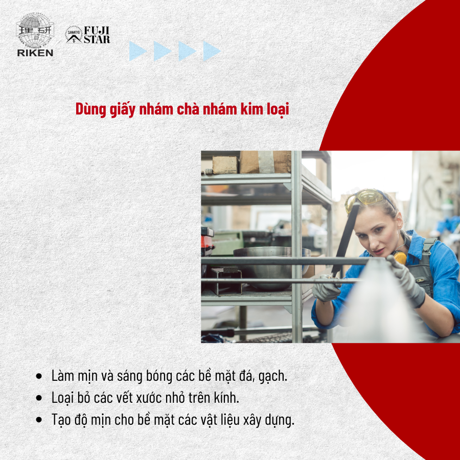 Trong ngành cơ khí và gia công kim loại, giấy nhám đóng vai trò quan trọng trong việc làm mịn bề mặt các chi tiết kim loại, loại bỏ các vết gỉ sét và làm sạch bề mặt. Giấy nhám phù hợp với nhiều loại kim loại như thép, nhôm, đồng và inox, giúp tăng cường độ bóng và làm sạch bề mặt kim loại trước khi tiến hành các công đoạn sơn phủ hoặc hàn.