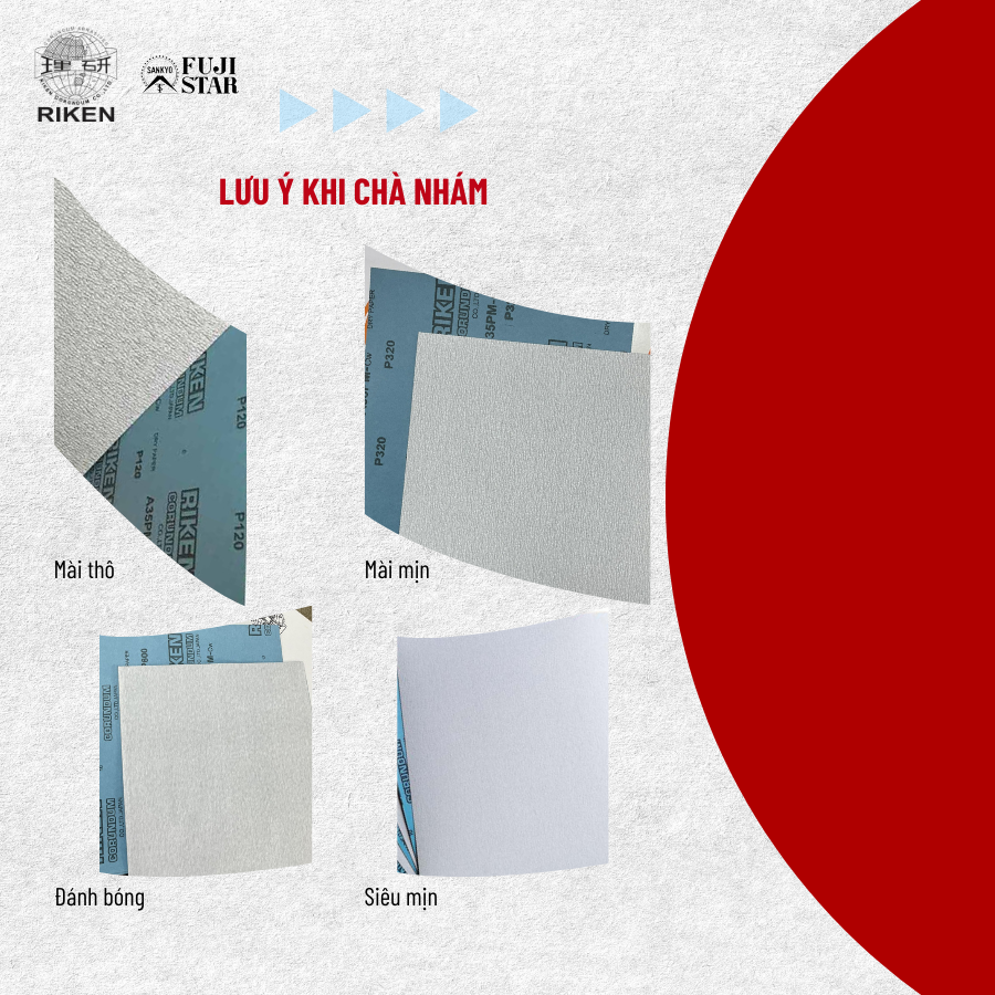 Giấy nhám có nhiều loại với các độ hạt khác nhau, mỗi loại phù hợp với từng công đoạn chà nhám: